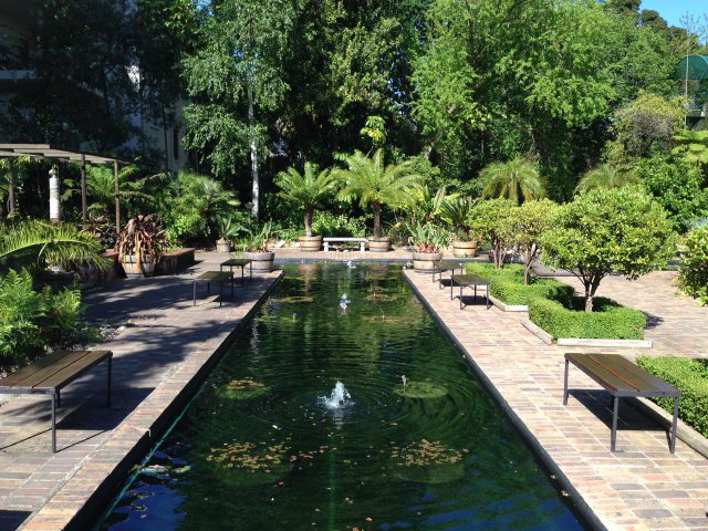Von Palmen am Wegesrand, vorbei an Sträuchern mit rot, orange, gelb blühenden Proteen, die zu einem Teich mit edlen Wasserlilien geleitet werden - Herzlich Willkommen im botanischen Garten der Universität Stellenbosch!