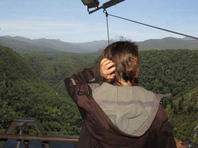 Diese Erfahrung schweißt wohl oder übel zusammen, wie ich noch feststellen werde. In meinem Fall schließt sich mir eine Sportgruppe 16-Jähriger Schülerinnen aus Pretroria an. Blutjung und athletisch scheinen alle heiß auf den Absprung zu sein – inklusive Lehrerin. Gemeinsam treten wir den Weg zur Käfigbrücke an, die sich unterhalb der Fahrbahn erstreckt und zur Absprungstelle mittig der Bloukrans Bridge führt. Euphorische Freudengesänge erstummen schlagartig, als wir uns mit Blick in den Abgrund zur Station vorkämpfen.