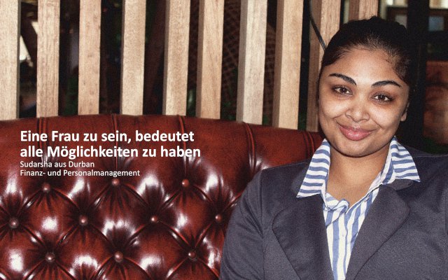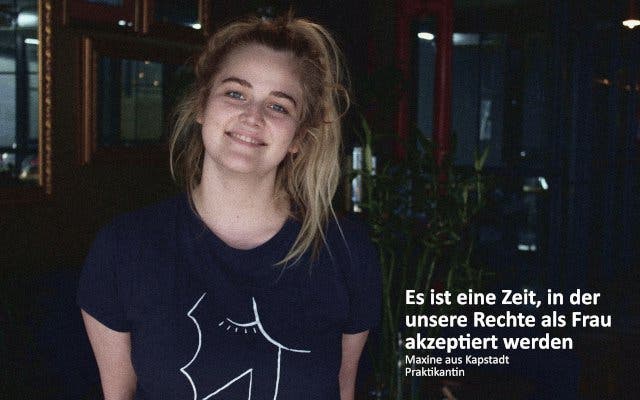 Eine absolute Powerfrau ist Maxine aus Kapstadt. Sie macht ein Praktikum mitten in der Stadt. „Für mich bedeutet es, die Freiheit zu haben, meine Bewunderung anderen starken Frauen gegenüber auszudrücken. Es ist eine Zeit, in der unsere Rechte als Frau akzeptiert werden.“ Und sie ist sich sicher, dass die Menschen aufhören müssen, Frauen nur in der Rolle als Hausfrau und Mutter zu sehen. „Frauen spielen heutzutage ein viel größere Rolle.“ Frauen starten ihr eigenes Modelabel mitten in der Stadt. Umgeben von selbstebewussten Frauen fühlt sich Maxine pudelwohl. „Die Stadtmitte, mit all den Karrierefrauen ist so inspirierend“