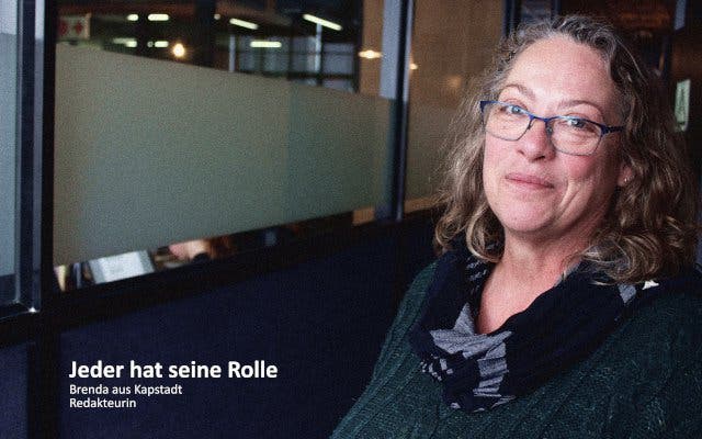 Kapstädterin und Redakteurin Brenda ist hier geboren und aufgewachsen. „Die Absicht ist es, dass Frauen gleichberechtigt sind. In der Realität ist das aber nicht der Fall.“ Eine weibliche Zukunft? Nein! Brenda ist sich sicher, dass man jeden einzelnen Menschen für eine erfolgreiche Zukunft braucht. „Jeder hat seine Rolle.“ In Fish Hoek ist ihre Heimat. Der Strand ihr Wohlfühlzone. "Ich kenne den Ort sehr gut. Am Strand finde ich immer jemanden den ich kenne. Es ist sehr schön dort. Ich kann meine Gedanken dort sortieren."