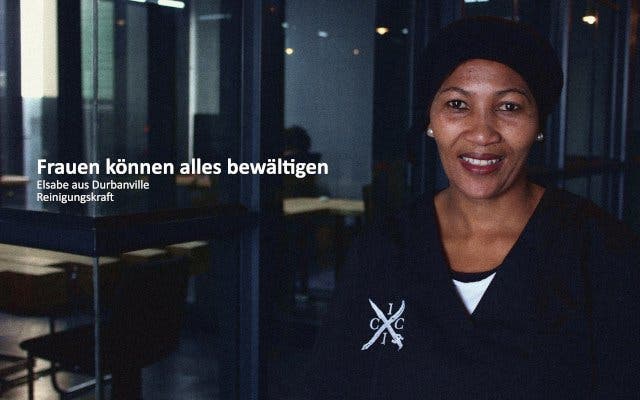 Elsabe aus Durbanville ist Reinigungskraft im Zentrum von Kapstadt. Sie findet es einfach toll, eine Frau zu sein und Möglichkeiten zu haben, alles machen zu können was sie möchte. „Frauen sind stark. Frauen können alles bewältigen.“ In einem Café bei einem heißem Getränk kann sie sich entspannen.