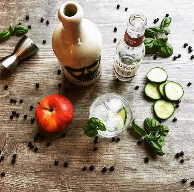 Unser Slogan lautet „Ohne Schnickschnack“. Es gibt ja mittlerweile Unternehmen, die ihren Gin mit Zutaten von exotischster Herkunft herstellen. Das kann man natürlich so machen. Die Zutaten die wir jedoch benutzen, sind einfach und bodenständig: Gurken, Basilikum, Wacholder und Äpfel – also nichts extrem wildes.