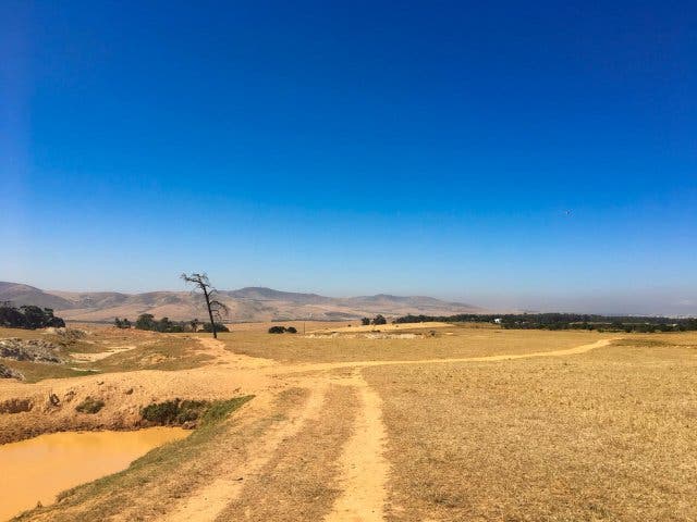 Wir reiten auf schmalen Pfaden durch die unendlich scheinende der Gegend rund um Durbanville. Vor uns erstrecken sich unzählige Felder und in der Ferne haben wir einen atemberaubenden Ausblick auf den Tafelberg. Wir kommen an einer Straußenfarm vorbei und werden neugierig von den großen Vögeln beäugt. Unsere Pferde bleiben allerdings vollkommen entspannt. Selbst als wir an einem Gepardengehege vorbeikommen und die Raubkatzen ein deutliches Jagdinteresse zeigen, lassen sich die Tiere nicht aus der Ruhe bringen.