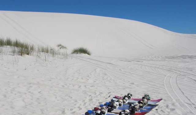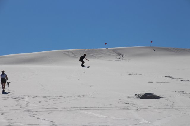 In einem dort aufgestellten Zelt, welches Sonnenschutz bot, empfing uns ein Sandboard-Coach. Vor ihm angereiht erwarteten uns die Snowboards, die zu Sandboards umfunktioniert wurden. Nachdem wir unser Gepäck abgelegt hatten, begann ein kurzer aber intensiver Kurs. Der Experte erklärte uns die Basics und machte uns mit den wichtigsten Elementen des Sandboardens vertraut. Er zeigte uns wie wir die Bindung der Boards optimal befestigen, wie Kurven gefahren werden und wie wir uns zu bewegen haben. Als jeder mit einem geeigneten Board ausgestattet war, liefen wir die Düne einige Meter hoch, um uns zu probieren. Nachdem jeder zwei Mal gekonnt nach unten kam, gestattete er uns den Aufstieg bis nach ganz oben. Euphorisiert sprinteten wir in der prallen Hitze auf die Spitze der Düne, befestigten oben angekommen umgehend unser Board und fuhren los.