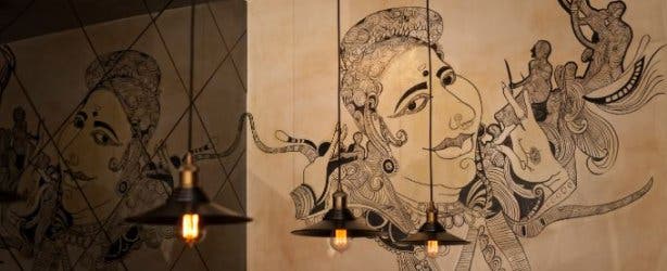 Oder du kannst die hübschen Kunstwerke und Innenausstattung bewundern, wie die vielen Fotos von Menschen und Szenen in Südindien. Und dann gibt es noch zwei riesige Wand-”Tattoos”, die zwei der ältesten noch existierenden indischen Artefakte darstellen, die derzeit in Paris zu bestaunen sind.