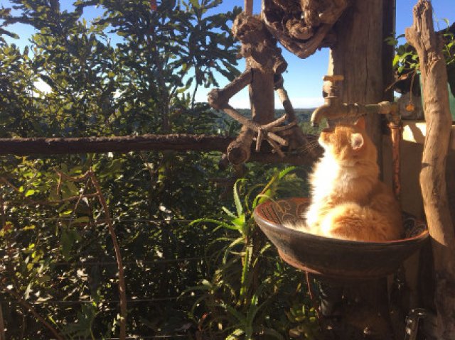 In keinem Märchen dürfen Tiere fehlen! Diese warten bereits auf dich, wenn du wieder herunter gekraxelt bist. Mach Bekanntschaften mit riesigen rot-getigerten Katzen, die gerne in Waschbecken schlafen. Die ebenfalls riesigen liebevollen Hunde bellen nur bei Pavian-Witterung. Dann gibt es noch ein paar anmutige Pferde (Ihre besonderen Eigenschaften blieben der Autorin im Verborgenen). Wenn du mit deiner Streicheleinheit fertig bist, ist vielleicht noch kurz Zeit für einen kleinen Schwebegang: Auf der Slag-Line entlang balanciert geht’s in Richtung Terrasse!