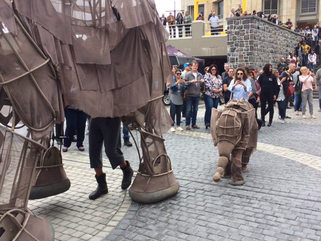 Riesige Elefantenpuppen tanzten zur Eröffnungsfeier an der Waterfront.